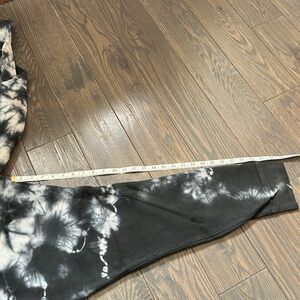 Lululemon scuba jogger. Size 12. Black/gray and white tie dye pattern, Earth Dye Stone is the color. They do have a hole on the back of their left leg. Shown. It’s about 11” down. Someone could probably cut these off to be a scuba short. Or are fine for an old pair to wear around home. I personally just don’t like them as I am taller and they hit me at an odd spot. Smoke free home!