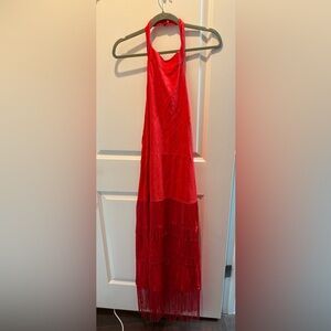 NWT Anthropologie Red Fringe Halter Valentines Tiered Fringe Maxi Dress 14