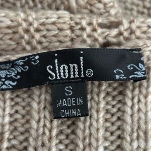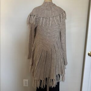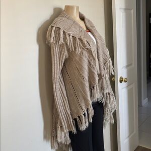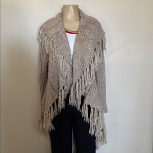 A beige fringed open-front cardigan. It is characterized by its chunky knit, draped or "waterfall" silhouette, and decorative fringe details along the front panels and hem.