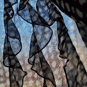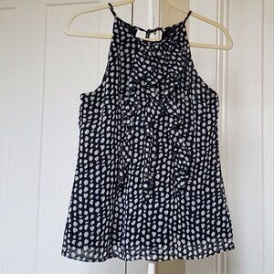 Ann Taylor sleeveless dark navy with beige formless dots blouse with lining. Shell 100% non-stretchable polyester fabric feels like silk. Lining is 100% stretchable polyester fabric. Both separately are see-through but combined give you sophisticated chic look. Round neckline with tie back closure. It has 3 beautiful ruffles on the front. Complete open shoulders, strapless. Lightweight. Machine wash cold. Pre-owned, perfect condition. Pit-to-Pit around 36 in, Length 26 in.