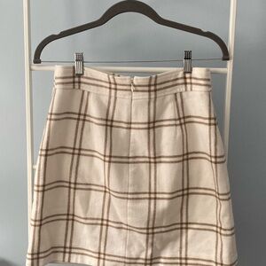 Stylish mini skirt with a classic plaid pattern. Features a chic white and tan design. Perfect for versatile styling.
