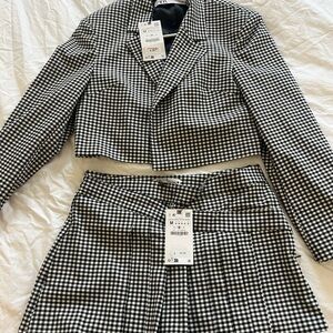 Stylish gingham blazer from Zara. Features a classic black and white pattern. Perfect for a polished look.