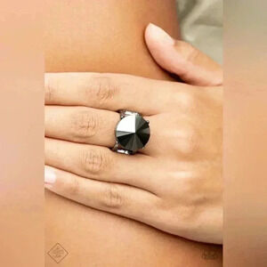 An oversized hematite rhinestone sits boldly atop two glistening bars of gunmetal, creating a dramatic statement piece. Features a stretchy band for an adjustable fit.