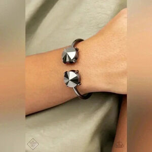 Two dramatically oversized hematite rhinestones are nestled inside pronged gunmetal fittings at the ends of a hinged gunmetal cuff, creating a smoldering statement piece that wraps boldly around the wrist. Features a hinged closure.