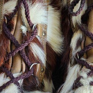 Vintage in pristine condition. Leather, Goat hair, sherpa fleece. Size 9. Cream, White & Brown, 14.5" Tall.