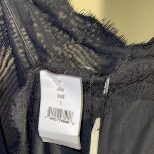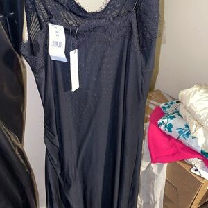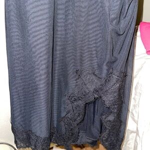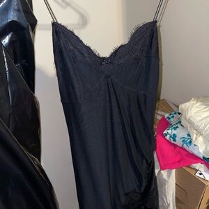 Elegant black mini dress with delicate lace trim. Spaghetti straps. Perfect for evening wear.