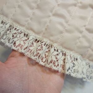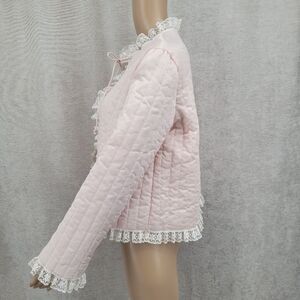 Chic pink quilted jacket featuring elegant lace trim. Perfect for adding a touch of sophistication to any outfit.