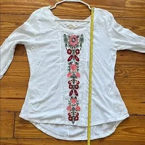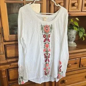 Elegant white blouse featuring vibrant floral embroidery. Long sleeves with intricate details. Perfect for a chic ensemble.