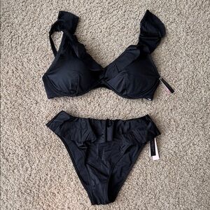 Chic black bikini with stylish ruffle accents. Ideal for a fashionable beach day. Top is 34ddd, buttons are Medium.
