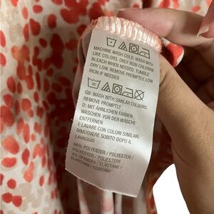 96% polyester, 4% spandex. Flowy material with stretch. 3/4 length sleeves. Slightly curved hem. Boat neck neckline. Keyhole back with ribbon tie. Abstract dot all over print in orange/pink (coral) and beige/taupe.