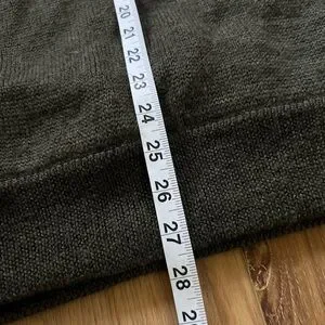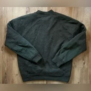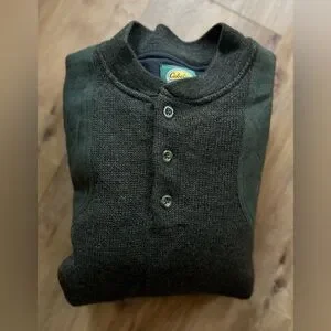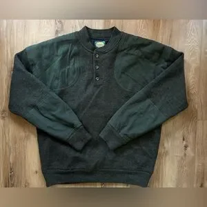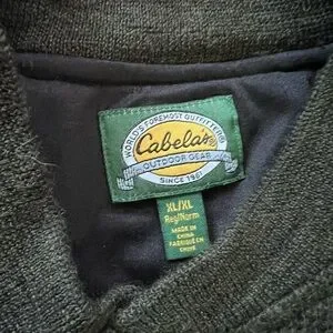 Built for deep winter conditions, this Cabela’s outdoor sweater is a rugged, insulated staple designed for hunting, hiking, camping, and extended time outdoors. The exterior is a thick, textured 100% wool knit in a dark forest green tone, offering natural warmth, breathability, and durability. Inside, it’s fully lined with smooth polyester, creating a wind-blocking barrier that adds warmth without bulk and makes it comfortable to layer.