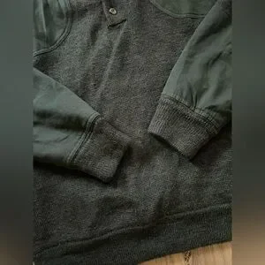 This piece features quilted reinforced shoulder panels — a key functional detail for hunters and hikers who carry packs or shoulder rifles, helping reduce wear and add insulation where it’s needed most. The buttoned henley neckline allows adjustable ventilation, while the ribbed cuffs and hem help seal in heat. Heavy knit sleeves with reinforced elbow panels add durability for active outdoor use.