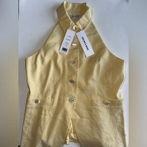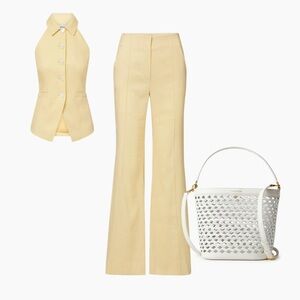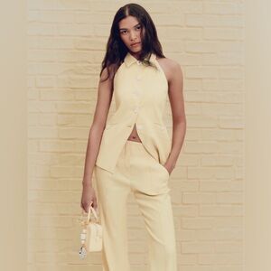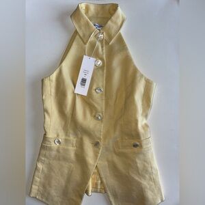 A fresh take on our best-selling vest silhouette. Crafted from an Italian stretch-linen blend in trending butter yellow, Orlinda is cut for a slim, waist-defining fit with a collared, halter-style neckline. Its single-breasted closure features an angled, high cut split hem—revealing the waistband beneath—and is finished with opalescent buttons and welt pockets. Wear this vest top with the coordinating Brit short for a chic spring set.