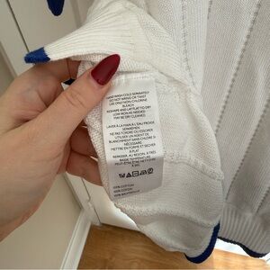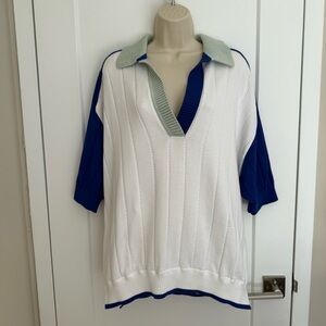 This rugby sweater by Maeve is crafted from 100% cotton. It features short sleeves, a v neckline with collar, pullover styling and an oversized fit.