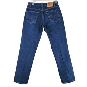 This is a pair of Levi's 505 blue jeans for men in size 34x32, with a regular fit and straight leg style. The jeans have a dark wash and were manufactured in August 1999. The inseam measurement is 32 inches.