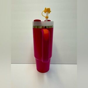 Vibrant pink travel mug. Features a sturdy handle. Yellow straw cap adds a pop of color. Ideal for on-the-go use.