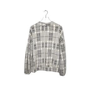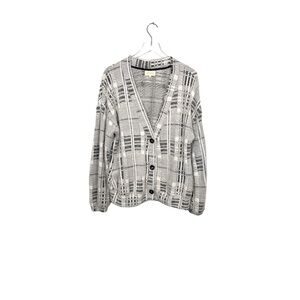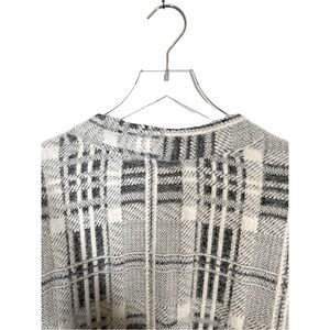 Delightfully fuzzy, plush and soft Melloday grandpa cardigan with three buttons and v-neck. Plaid shades of grey, black, and ivory. Sweater is long and comfy for chilly weather. Fabric tag is missing but fabric content is 80/20 nylon/poly blend. Excellent pre-owned condition. Size L