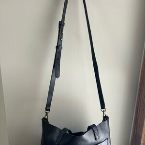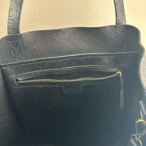 Madewell black leather tote bag. Perfect for everyday use with ample space for essentials. Use tote straps or adjustable shoulder strap.