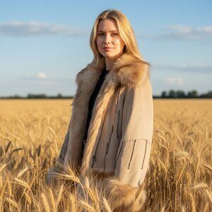 Color: The jacket is a tan or beige color with contrasting fur trim.