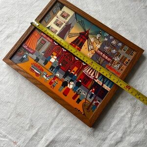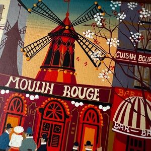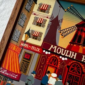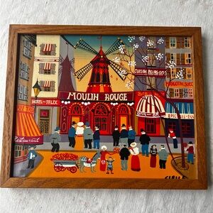 Vibrant framed art featuring the iconic Moulin Rouge. Rich colors and lively scene.