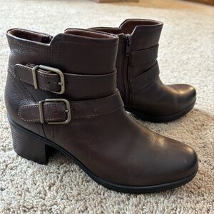 Elegant dark brown ankle booties by Clarks. Very comfortable, but slightly small for 9.5. Feel more like size 9. Gently used.