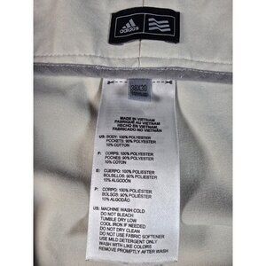 The Adidas Performance Golf Pants for men in size 38x30 are a stylish and versatile addition to any wardrobe. Made from polyester knit fabric, these beige chinos feature a flat front design with a mid-rise fit and straight leg style. Perfect for various occasions, including casual, formal, and business settings, these pants offer comfort and practicality with features such as pockets and a machine-washable construction. The Adidas logo accents add a touch of sporty flair to the classic chino silhouette, making these pants suitable for both preppy and athletic looks.