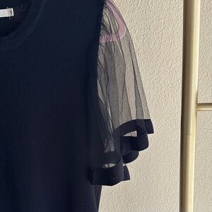 Make a statement! A simple black top becomes a standout with these generous sheer short sleeves. Beautiful dressed up or down.