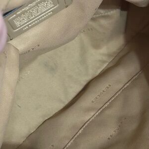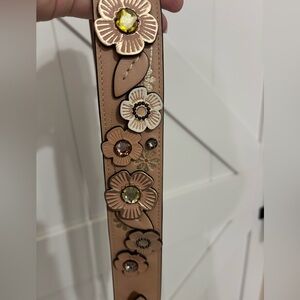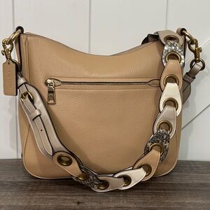 One of a Kind Upcrafted Coach Chaise crossbody bag in beige pebbled leather. Features tea rose floral embellishments and not one, but TWO unique straps. One strap features gold hardware with loop straps complete with snakeskin detail. A second strap includes more tea rose detail with gun metal hardware complete with a mini metal Coach hang tag. Minor wear on the corners and a few pen marks inside the bag, but this bag is absolutely stunning with either strap. Comes with a Coach dust bag to protect your new unique Coach!