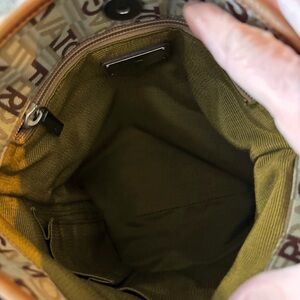 Elegant tote with iconic logo pattern. Features tan and brown hues. Perfect for everyday use.