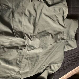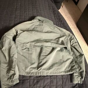 Olive green military-style jacket. Features multiple pockets. Durable and stylish.