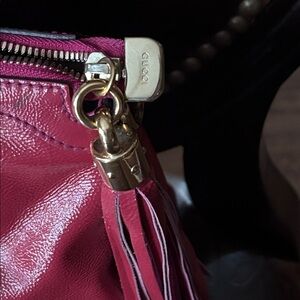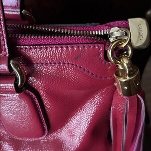 Add a pop of luxury to your collection with this stunning Gucci Soho bag. Crafted from high-shine patent leather in a gorgeous deep fuchsia pink, this bag features the iconic embossed interlocking G logo and the signature leather tassel charm. Color: Fuchsia / Magenta Pink