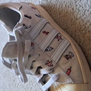 Adidas Originals Superstar 80s “Beach Icons” (Art. BZ0650), released around Spring 2017. This was a limited-edition embroidered version of the classic Superstar made with a canvas upper and decorated with small beach-themed motifs (starfish, sunglasses, ice cream, surfboard, etc.). It was part of Adidas Originals’ summer lifestyle pack that year, not a standard in-line release.