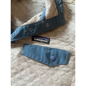 A soft, quilted Patagonia pullover in heather gray with blue accents, featuring a snap-button placket, chest pocket, and sustainable materials (organic cotton/recycled polyester).