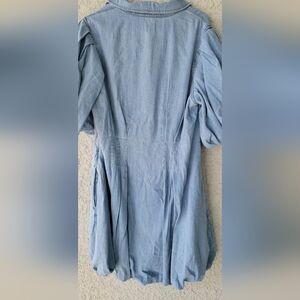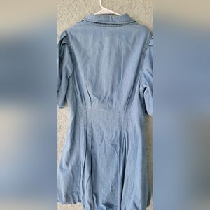 Stylish light blue mini dress with button-up front. Features short sleeves and a classic collar.