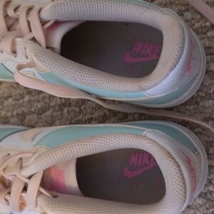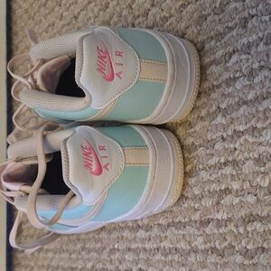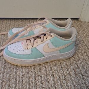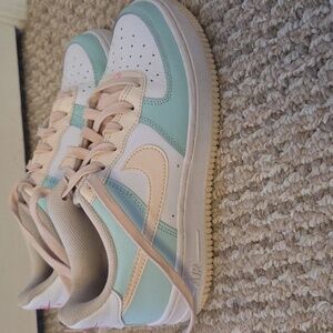 Stylish Nike sneakers in mint and cream. Features classic low-top design. in good condition, slight creases and a little bit dirty on the bottom.