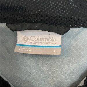 Sleek black windbreaker by Columbia. Features a white trim and hood. Perfect for outdoor activities.