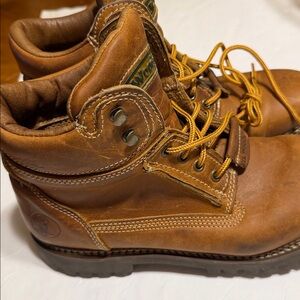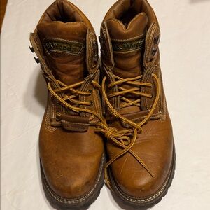 Rugged brown leather boots. Features sturdy yellow laces. Perfect for outdoor adventures.