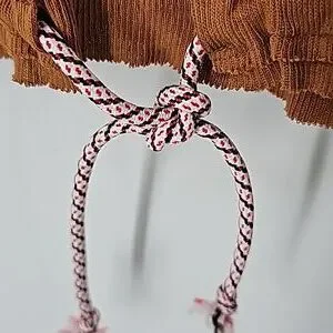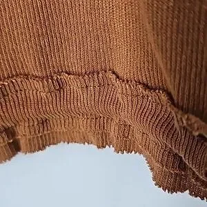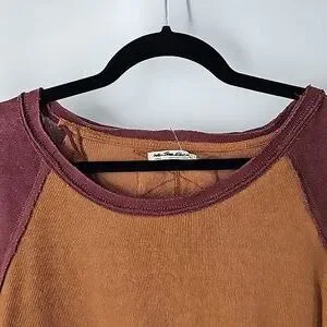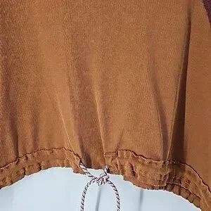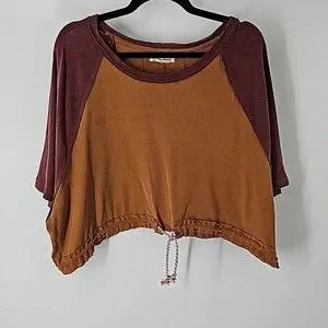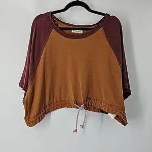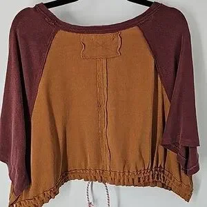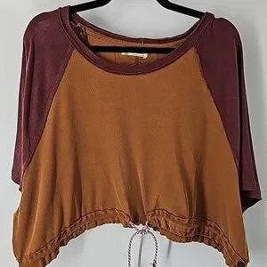 Stylish cropped top with drawstring hem. Features burgundy sleeves and mustard body. Perfect for casual wear.
