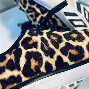 A sneaker with attitude! Genuine calf hair in a leopard print. Comfortable wide toe. Black interior with matching black laces.