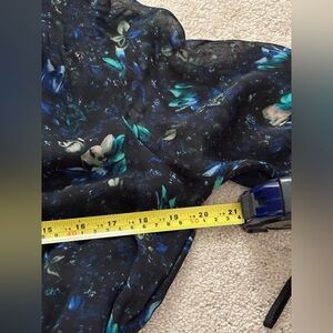 Turn heads in this stunning Anthropologie wrap-style dress featuring a dreamy dark floral print with hints of blue and green. The lightweight sheer chiffon overlay adds a soft, romantic flow to every step. Designed with a flattering V-neckline, long sheer sleeves with smocked cuffs, and a flowy tiered mini skirt for effortless movement. Fully lined for comfort.