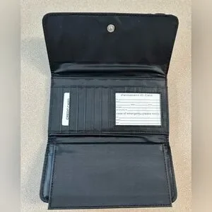 The wallet is a trifold with double snap closure. Has a removable checkbook cover, a window ID slot. Six credit card slots and 2 full length slots for dollar bills, insurance card etc. Also has a zipper slot on the outside back for cell phone, etc.