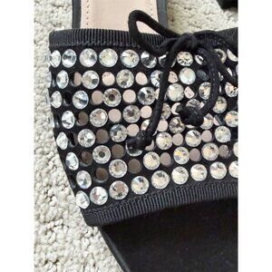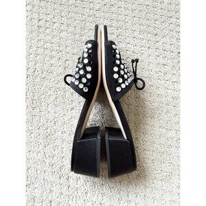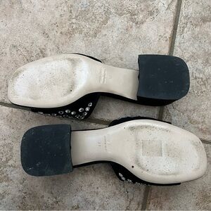 Elegant black miu miu mules sandals with sparkling silver embellishments. Authentic! Features a rhinestones, velvet and bow detail. Satin silk material in the heel. No missing stones. Worn exactly once for a dinner for only 2 hours. Size 37, fits a US 7. True to size