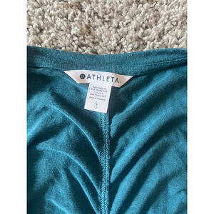 Soft, lightweight Athleta tank top in blue. Features ruched sides and a gathered V-neckline. Made from a sustainable Tencel™ Modal and polyester blend — comfortable, flattering, and perfect for yoga, lounging, or layering.