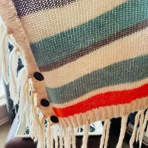 Stylish bohemian knit poncho featuring a geometric pattern. Earthy tones with fringe detailing. There are arm holes above the buttons on each side. Well loved. Pair with coral or sage green jeans or corduroys for a southwestern flare.