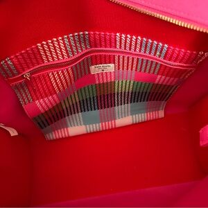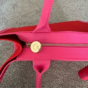 This KATE SPADE x TARGET Collab Pink & Red fabric “It's in the Bag” Tote is a stylish and practical handbag in a colorblock design. This large tote features a square shape, double pink handles, gold hardware, and a zip closure. The bag includes a mobile phone pocket, limited edition design, and a D-ring for keychains or charms. I have included a NWOT matching lipstick holder/keychain/charm. Made of polyester knit fabric, this tote is both fashionable and functional for women on the go. Perfect for carrying essentials while adding a pop of color to any outfit. Such a cute classic Kate Spade look! Bought it for my daughter (scoured the Targets!) and she never used it! My loss is your gain…