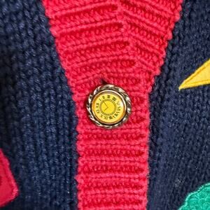 Vintage Sharon Young cardigan sweater with a festive holiday theme. Features a bold swan with wreath applique, large poinsettia, hanging ornament details, and Roman numerals reminiscent of a holiday clock striking midnight. Black knit base with red trim and gold-tone buttons. A true statement piece, perfect for Christmas parties, “ugly sweater” contests, or as a collectible vintage holiday knit.