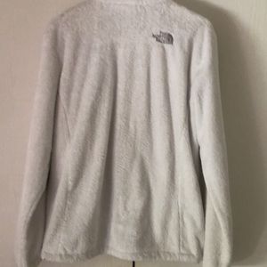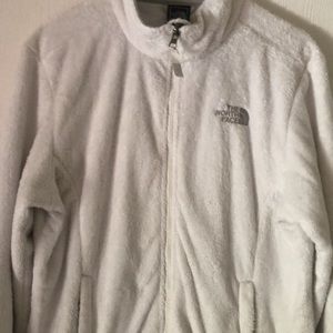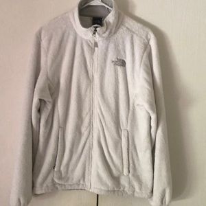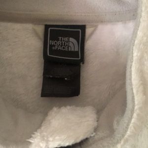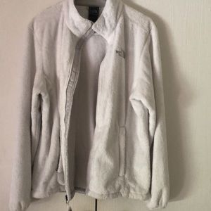 Women’s white cozy zip up Sherpa North face pullover jacket is in good used condition has hole & some peeling at cuffs see pictures for more details