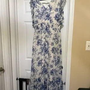 Elegant maxi dress with floral pattern. Features ruffled sleeves and a V-neckline. Perfect for special occasions.