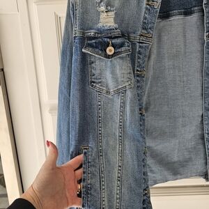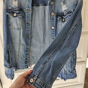 Stylish medium blue jean jacket with distressed accents. Perfect for everyday wear.