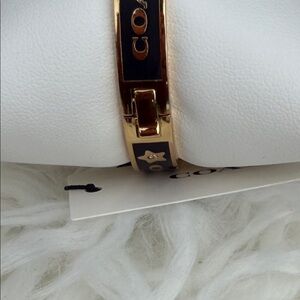 Stylish Coach bangle with heart accents. Black and gold design. Ideal for chic elegance.